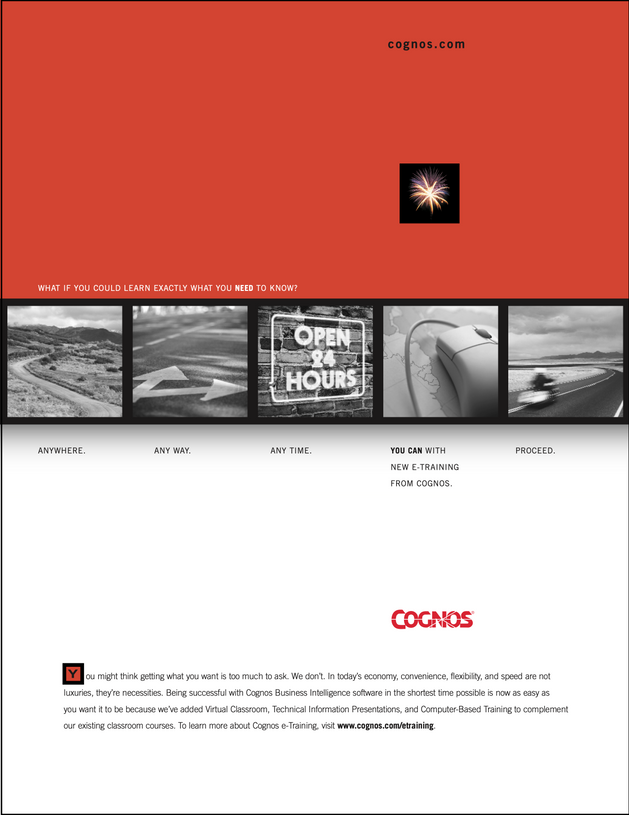 Cognos was an early and important client for McMillan. Numerous advertising goals were addressed throughout our tenure with this client, targeting a wide variety of initiatives.